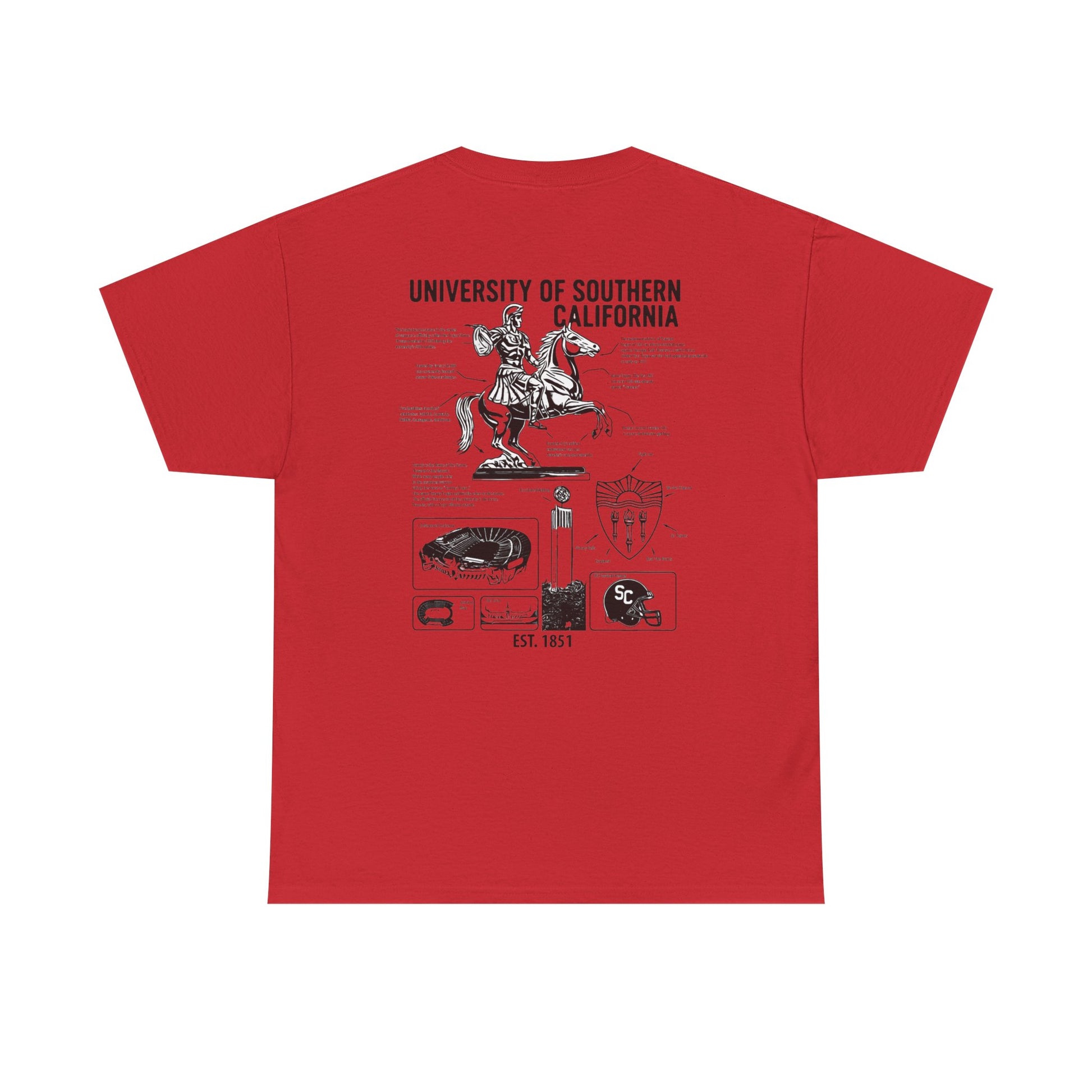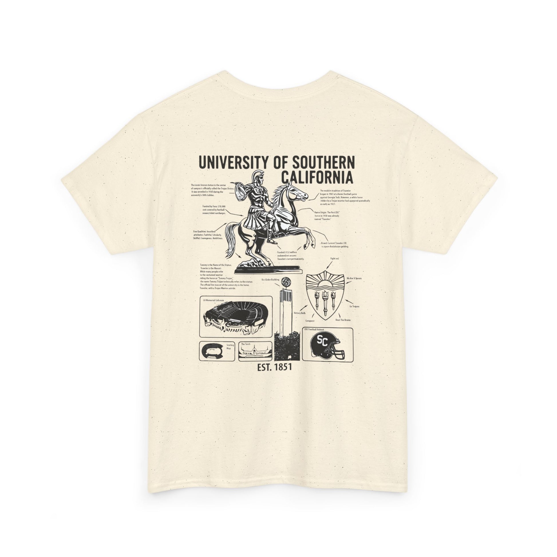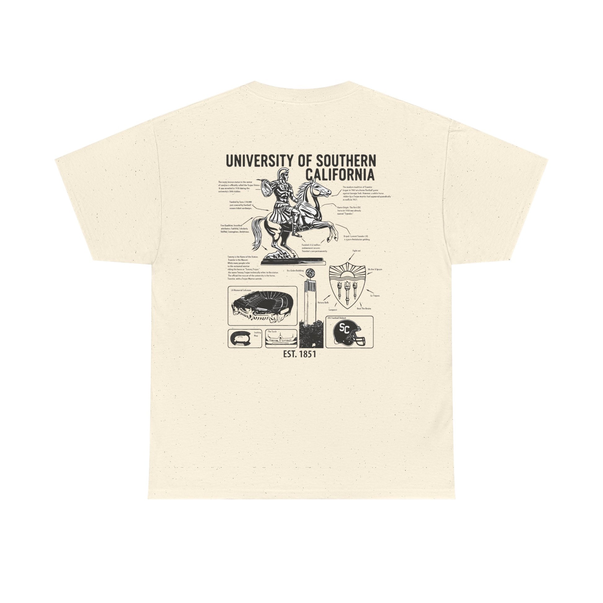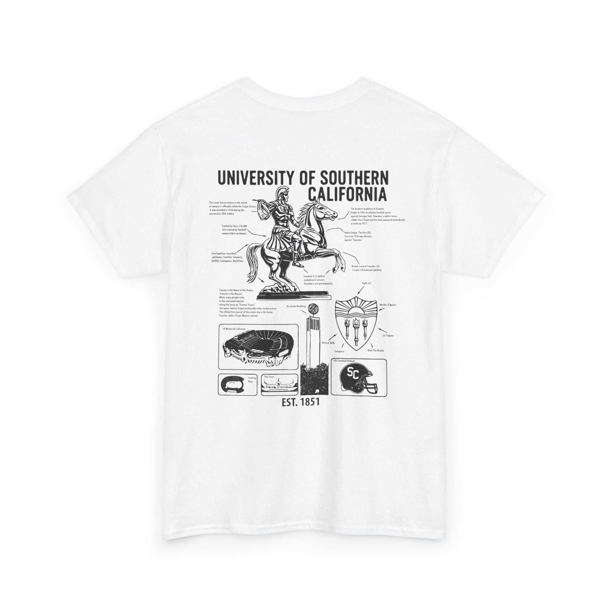 Unleash your inner scholar and superfan with the USC Facts Tee. This isn't just a shirt; it's a wearable testament to the spirit of Troy. Adorned with detailed illustrations of beloved landmarks and symbols, each graphic is paired with fascinating, bite-sized facts about the university's rich legacy. From the legendary Traveler to the architectural marvels of campus, wear your USC pride and knowledge. Fight On!