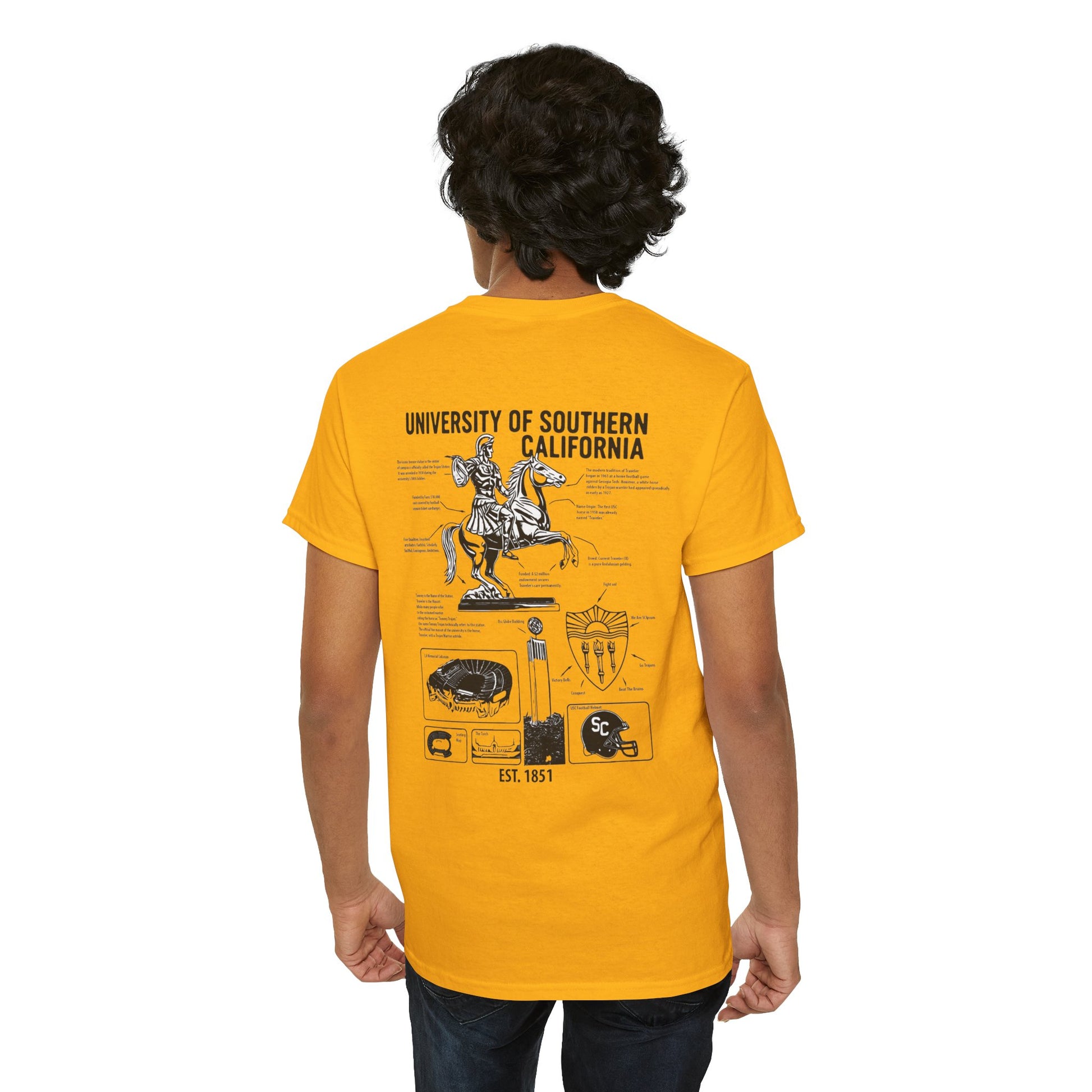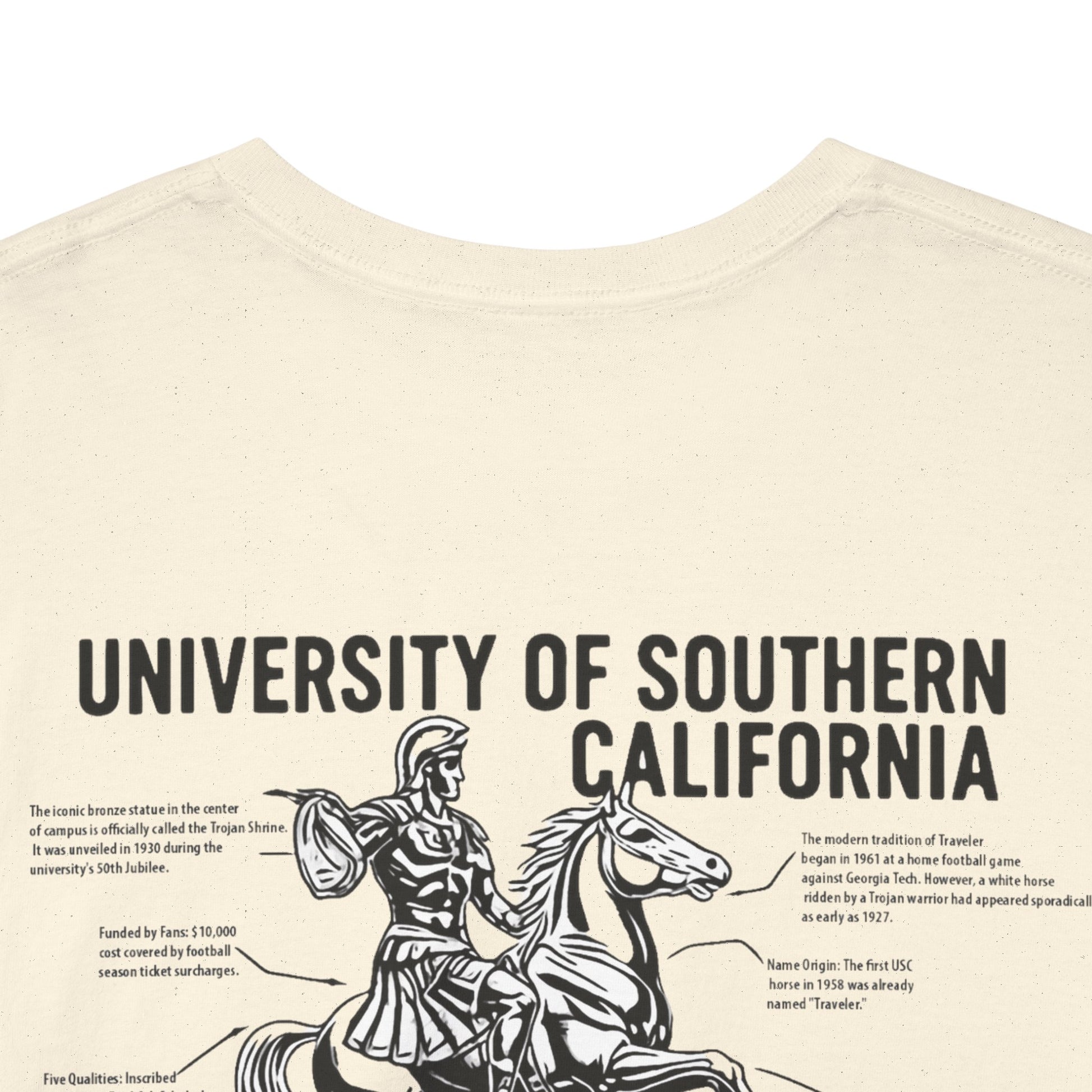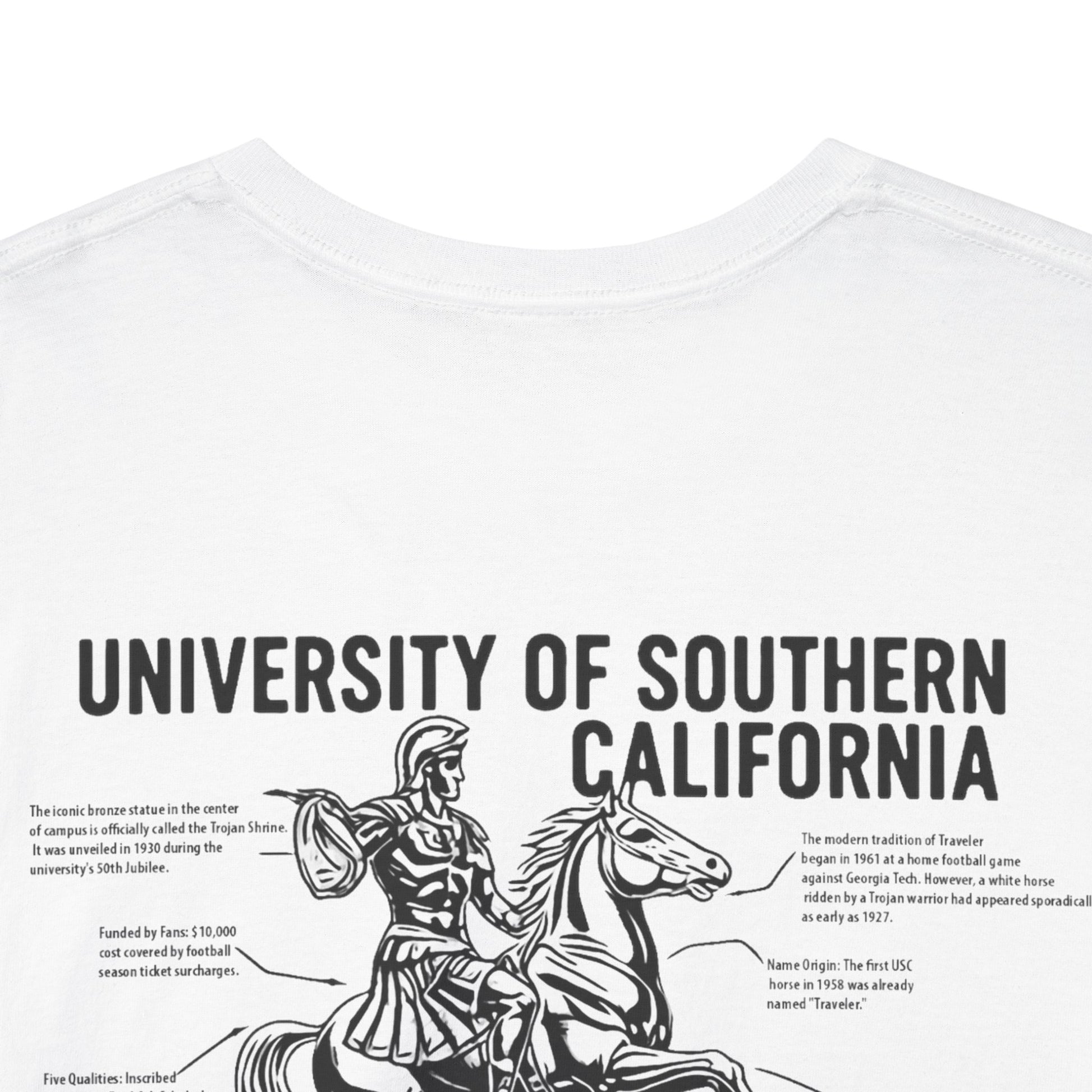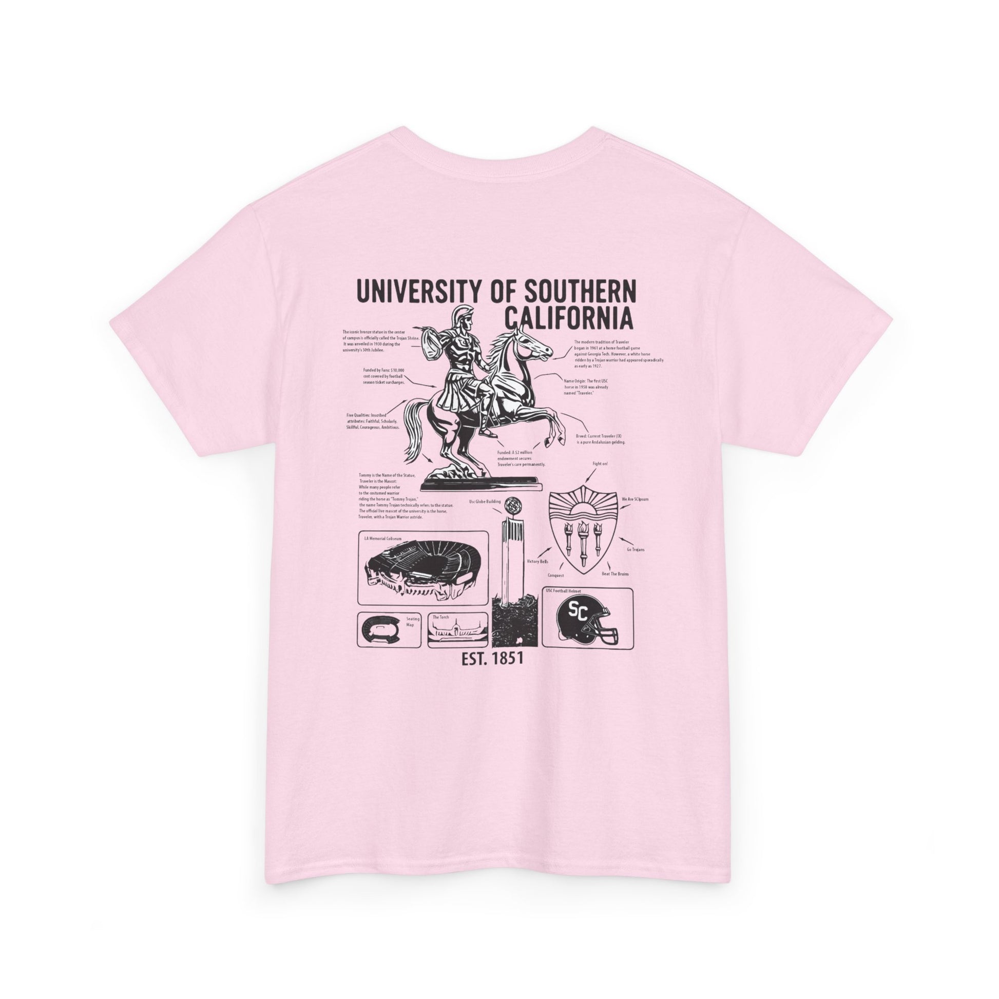 Unleash your inner scholar and superfan with the USC Facts Tee. This isn't just a shirt; it's a wearable testament to the spirit of Troy. Adorned with detailed illustrations of beloved landmarks and symbols, each graphic is paired with fascinating, bite-sized facts about the university's rich legacy. From the legendary Traveler to the architectural marvels of campus, wear your USC pride and knowledge. Fight On!
